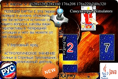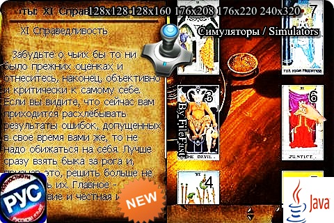 Если жизнь загнала тебя в тупик или тебе необходимо найти ответы на интересующие тебя вопросы, обратитесь к картам Таро! Год выпуска/Year of issue: 2012 Жанр/Genre: Симуляторы / Simulators Категория/Category: Java игры/Java games Размер экрана/Screen size: 128x128 128x160 176x208 176x220 240x320 Разработчик/Developer: J-Games Платформа/Platform: Java Формат файла/File format: .jar Вид устройства/Appearance of the device: для телефонов/for phones Язык интерфейса/Interface language: русский (RU) Размер/Size: 1,53 Mb Статус игры/The status of the game: бесплатная/free Подготовил/Prepared by: FileFast