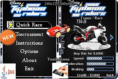 Геймеру надо гнать на мотоцикле для того, чтобы занять место ведущего на трассе. Собирай деньги для того, чтобы купить байк и использовать все особенности Тайфун для того, чтобы обогнать противников на дороге. Год выпуска/Year of issue: 2012 Жанр/Genre:Гонки / Race Категория/Category: Java игры/Java games Размер экрана/Screen size: 240x320 360x640 240x320 : S40 3ed Eng S60 3ed EngSE K770,K800,S500,T650,W850 Eng 360x640 : S60 5ed Eng SE U1i(Satio),U5I(VIVAZ),U8i Eng SAM i8910,i8910U,M8000 Eng Разработчик/Developer: Disney Mobile Платформа/Platform: Java Формат файла/File format: .jar Вид устройства/Appearance of the device: для телефонов/for phones Язык интерфейса/Interface language: английский (ENG) Размер/Size: 1,38 Mb Touch Screen/Stylus: есть/there are Статус игры/The status of the game: бесплатная/free Подготовил/Prepared by: FileFast